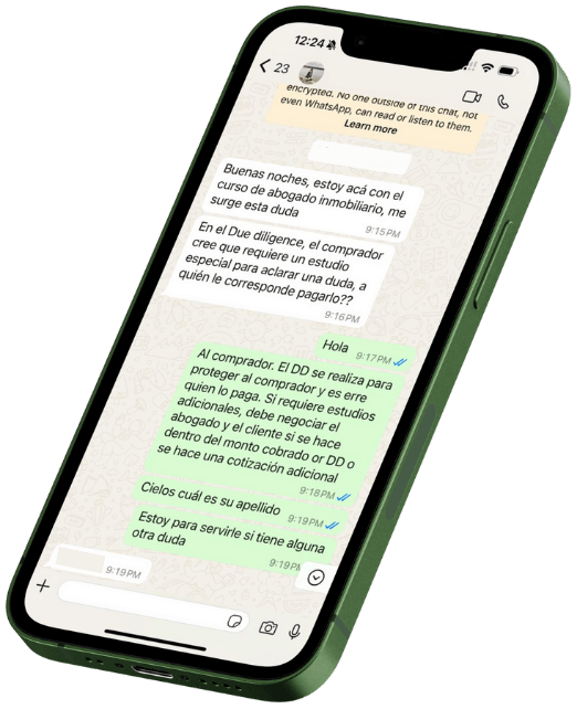 Podrá hacerme cualquier pregunta respecto a las clases o su práctica profesional dentro del derecho inmobiliario vía WhatsApp y yo le responderé personalmente.